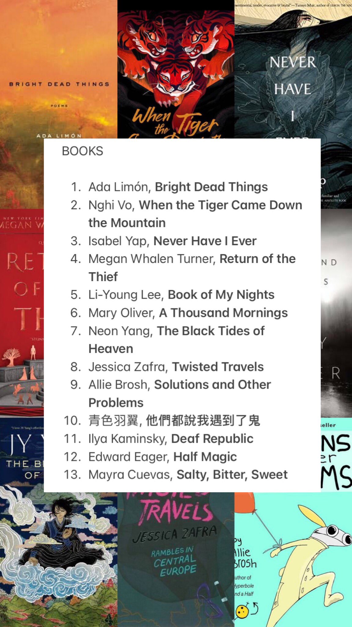 And I never knew survivalMostly poetry and short fiction, I can’t process novels anymore 😭 My favs were Ada Limón’s BRIGHT DEAD THINGS (poetry collection with themes of loss and illness), and Nghi Vo’s WHEN THE TIGER CAME DOWN THE MOUNTAIN (novella: about stories and storytelling). Ilya Kaminsky’s DEAF REPUBLIC was objectively brilliant but the subject matter was too difficult for me.