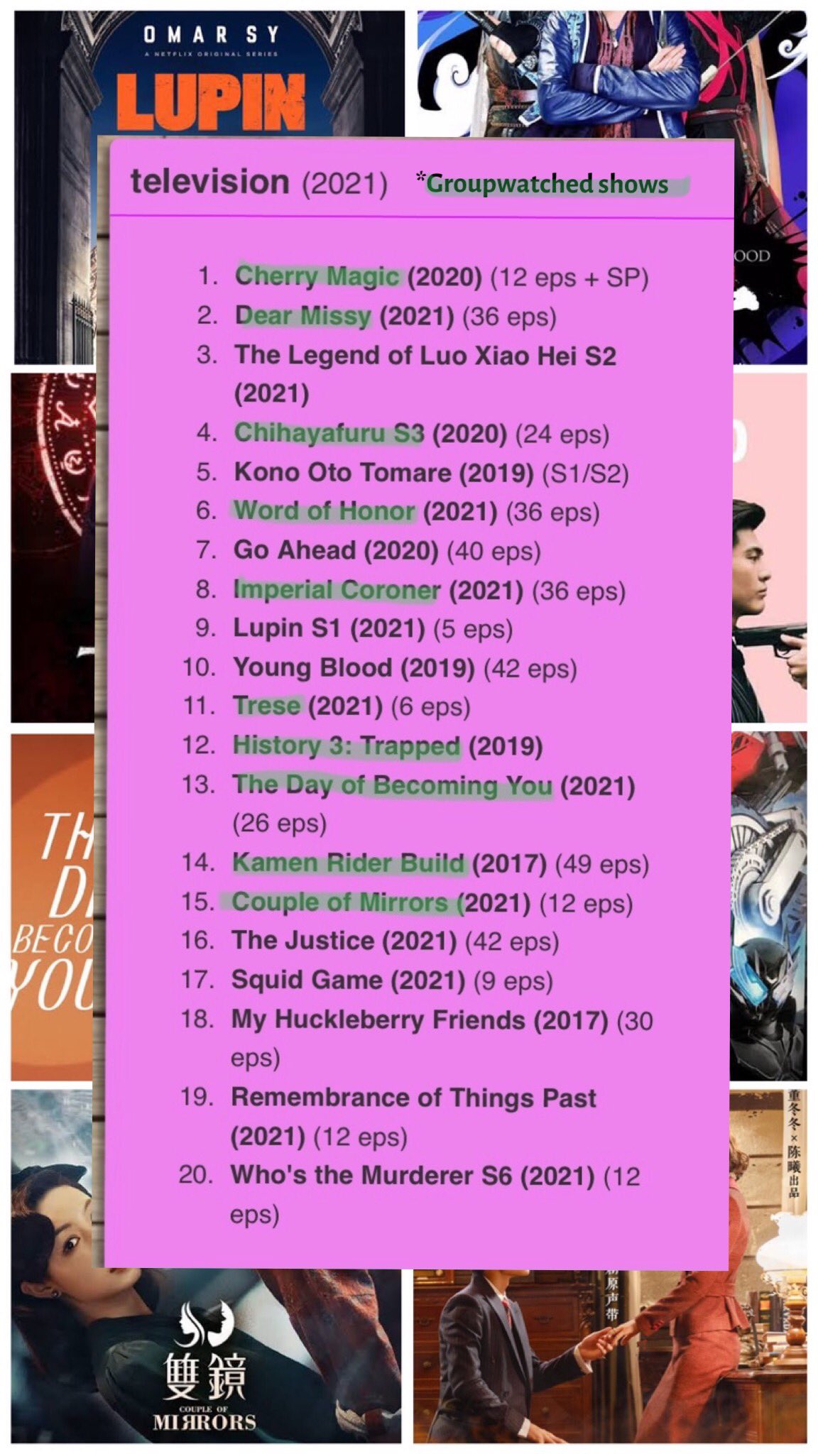 Most of the shows/movies I watched were groupwatches—our most successful one being SOUL MATE (2016 movie), because the twists and foreboding silence of the people who had already seen it sparked fear, tears, and fun discussions. 5/5, would recommendTV: